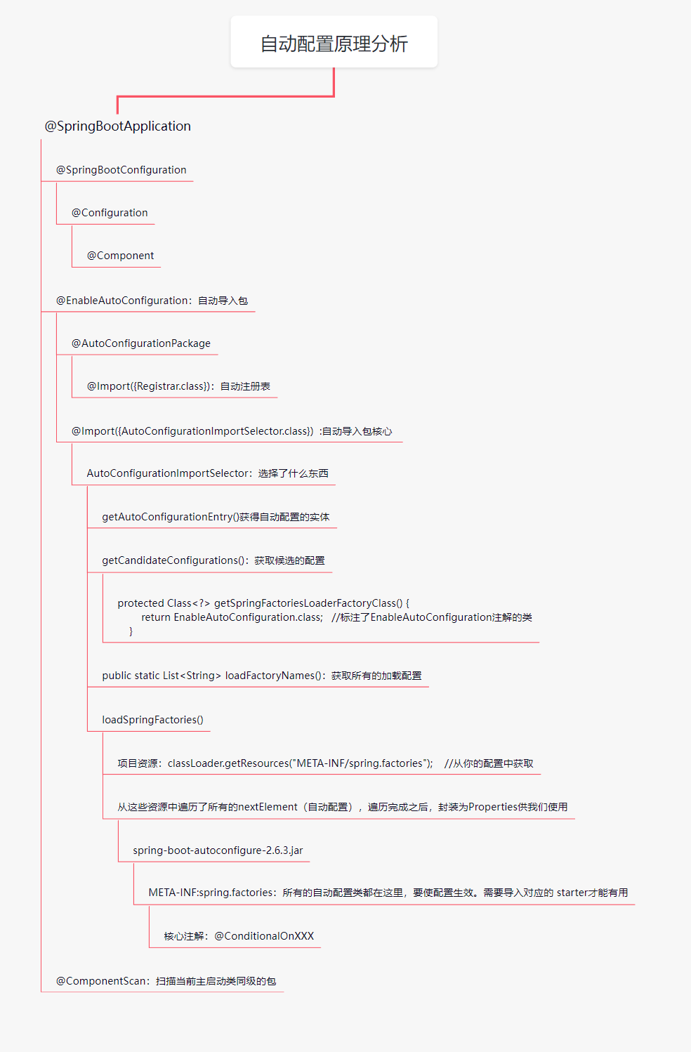 1 2 3 4 5 6 7 8 9 10 11 12 13 @SpringBootConfiguration :springboot的配置 @Configuration :spring配置类 @Component : 说明这也是一个spring的组件 @EnableAutoConfiguration :自动配置 @AutoConfigurationPackage :自动配置包 @Import({Registrar.class}) :自动配置 `包注册` @Import({AutoConfigurationImportSelector.class}) :自动配置导入选择 List<String> configurations = this .getCandidateConfigurations(annotationMetadata, attributes);
